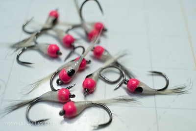 The Pink Ghost Perdigon nymph is a perfect winter fly. A hot pink tungsten bead head, black wing case, and white epoxy body gets down fast and imitates the eggs and nymphs that trout can't resist during the winter months.
