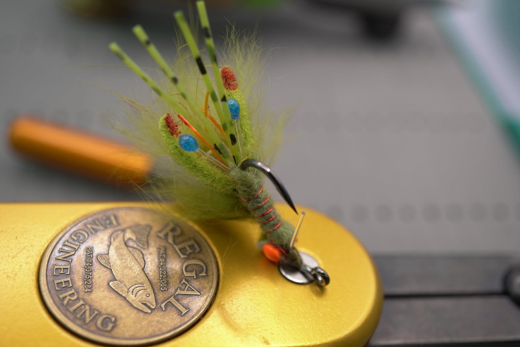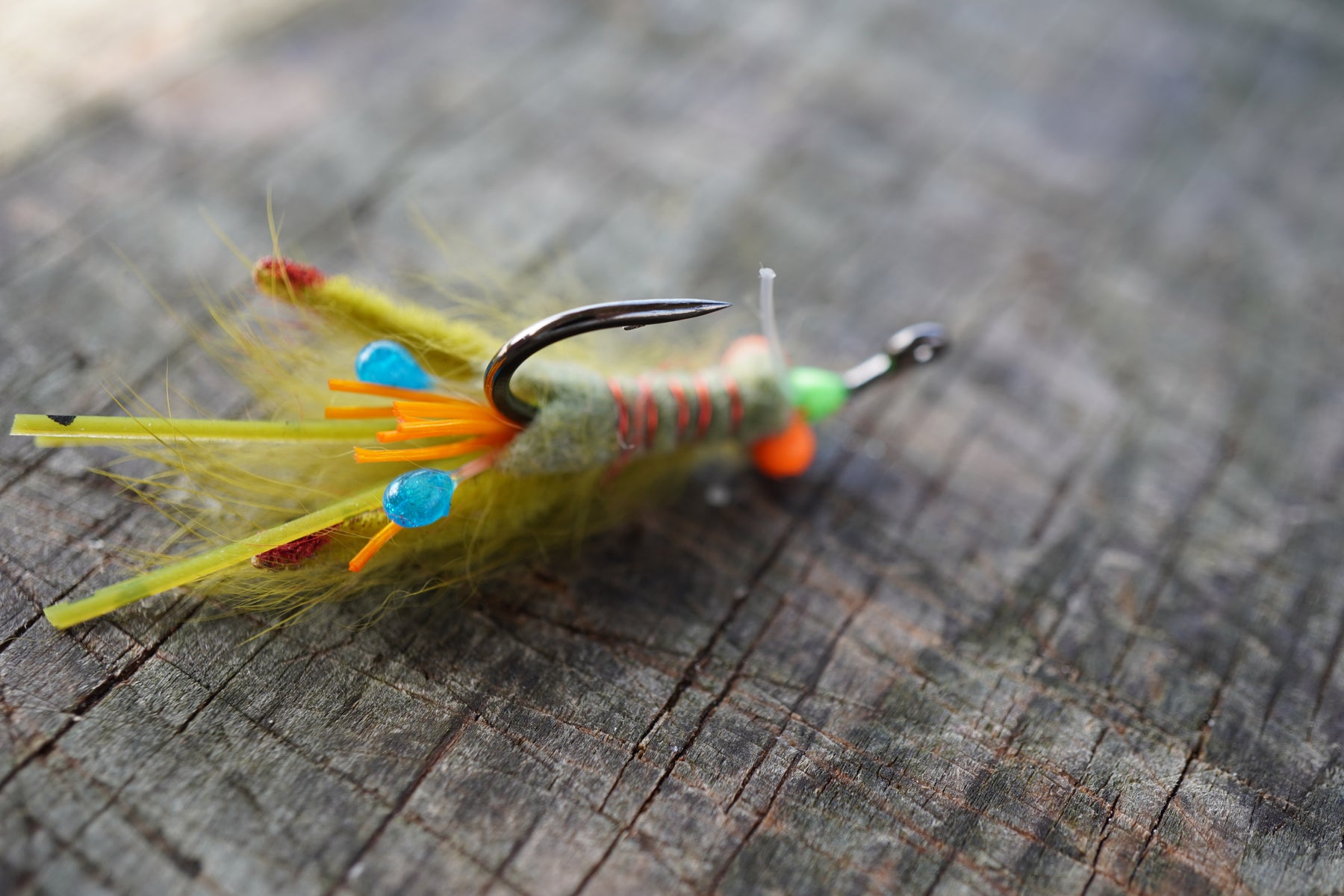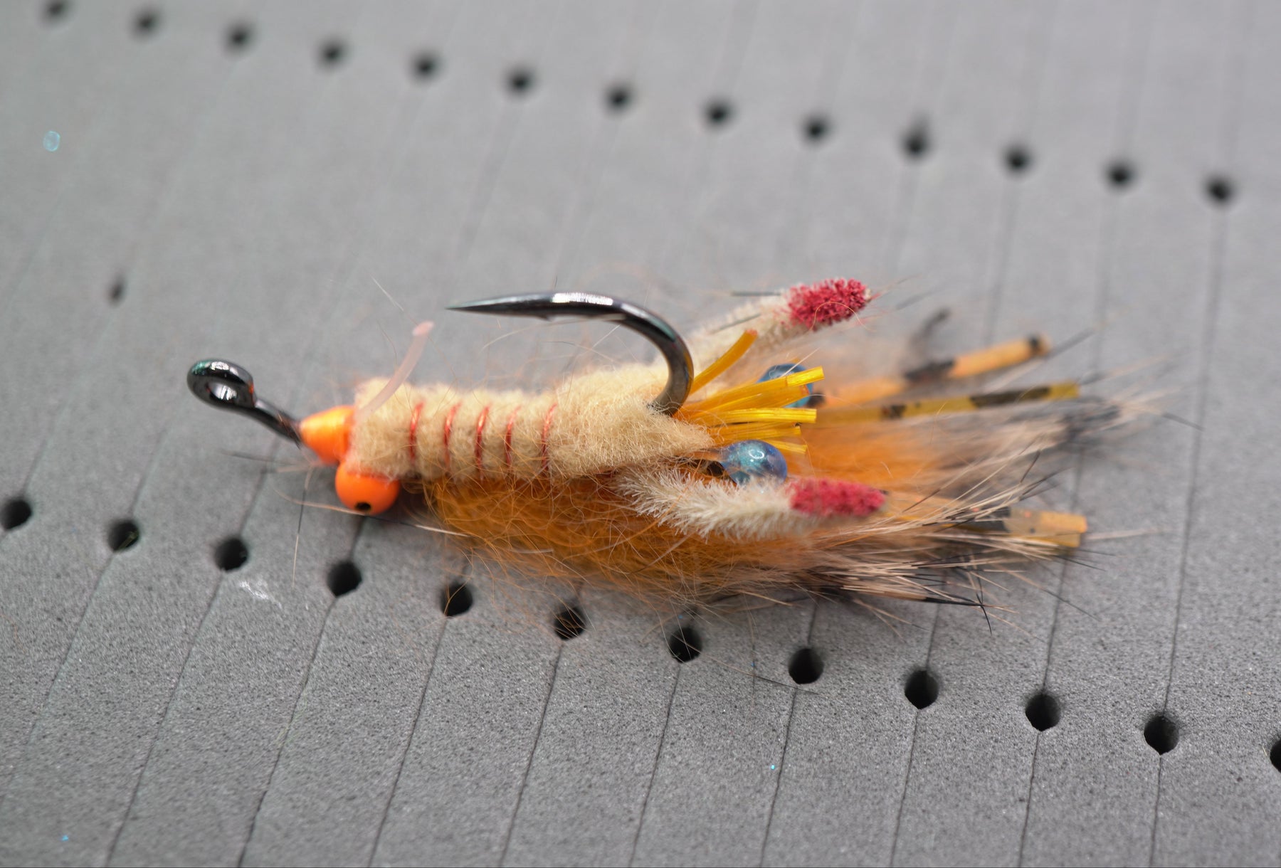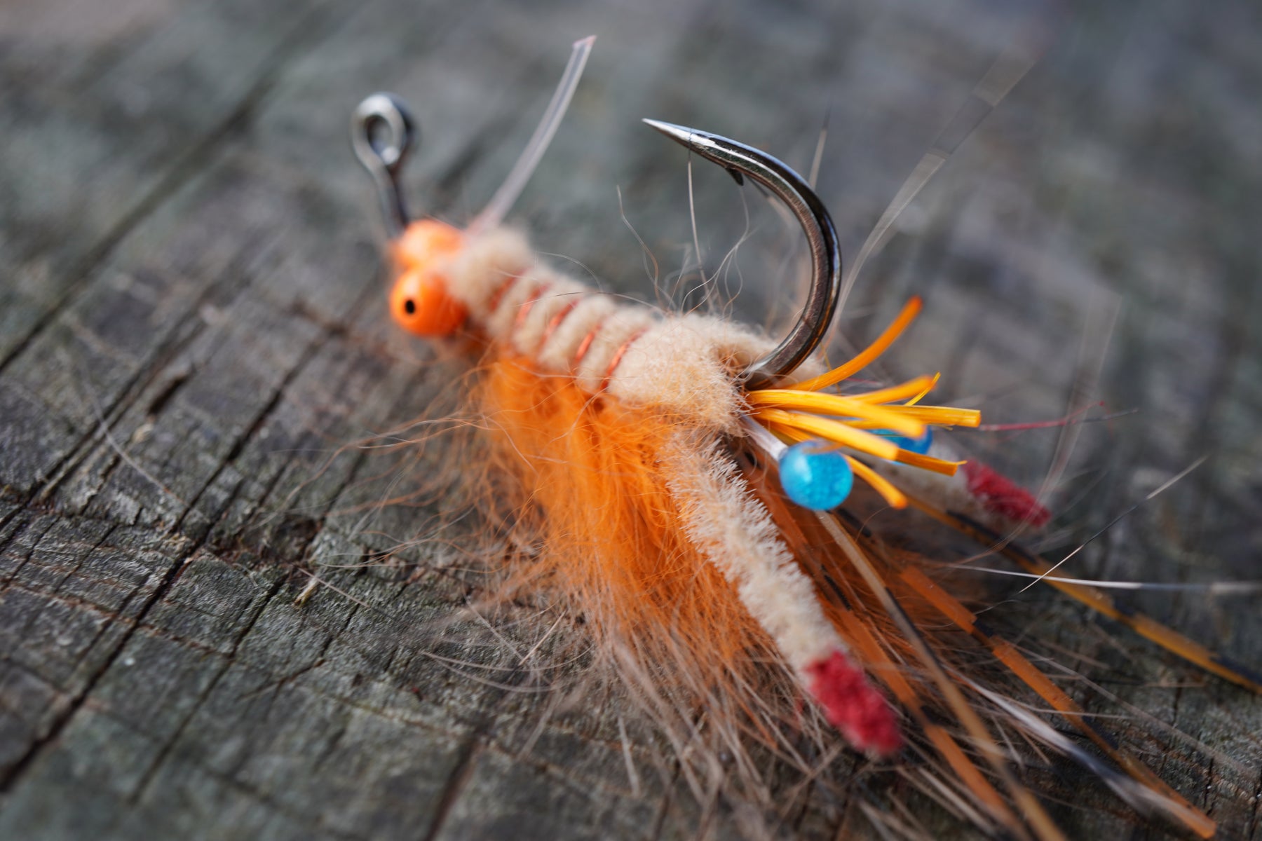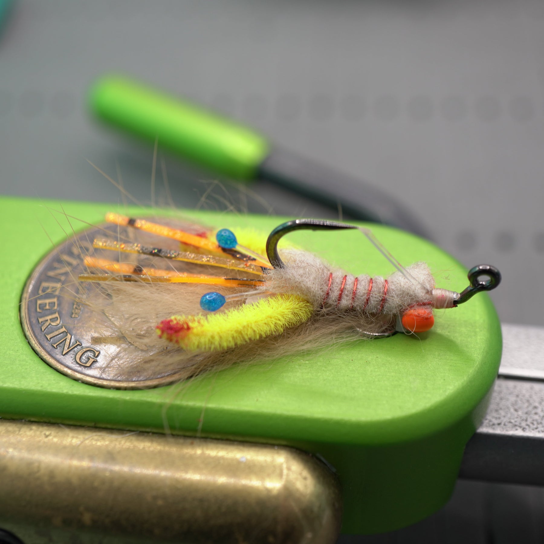 The Micro Psycho Mantis is a custom combination of blue Living Resin eyes, highly animating claws, micro rubber legs, contrasting rubber legs, and a multi-colored rabbit belly that pulsates. Hot orange bead chain or small dumbbells and a weed guard balance the Psycho so that it swims naturally and lands softly. It will get eaten by any fish that eats mantis shrimp or small crustaceans.